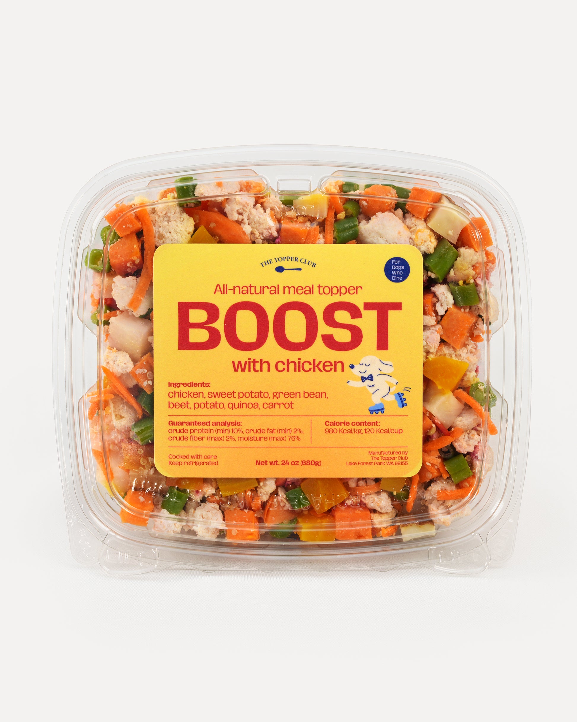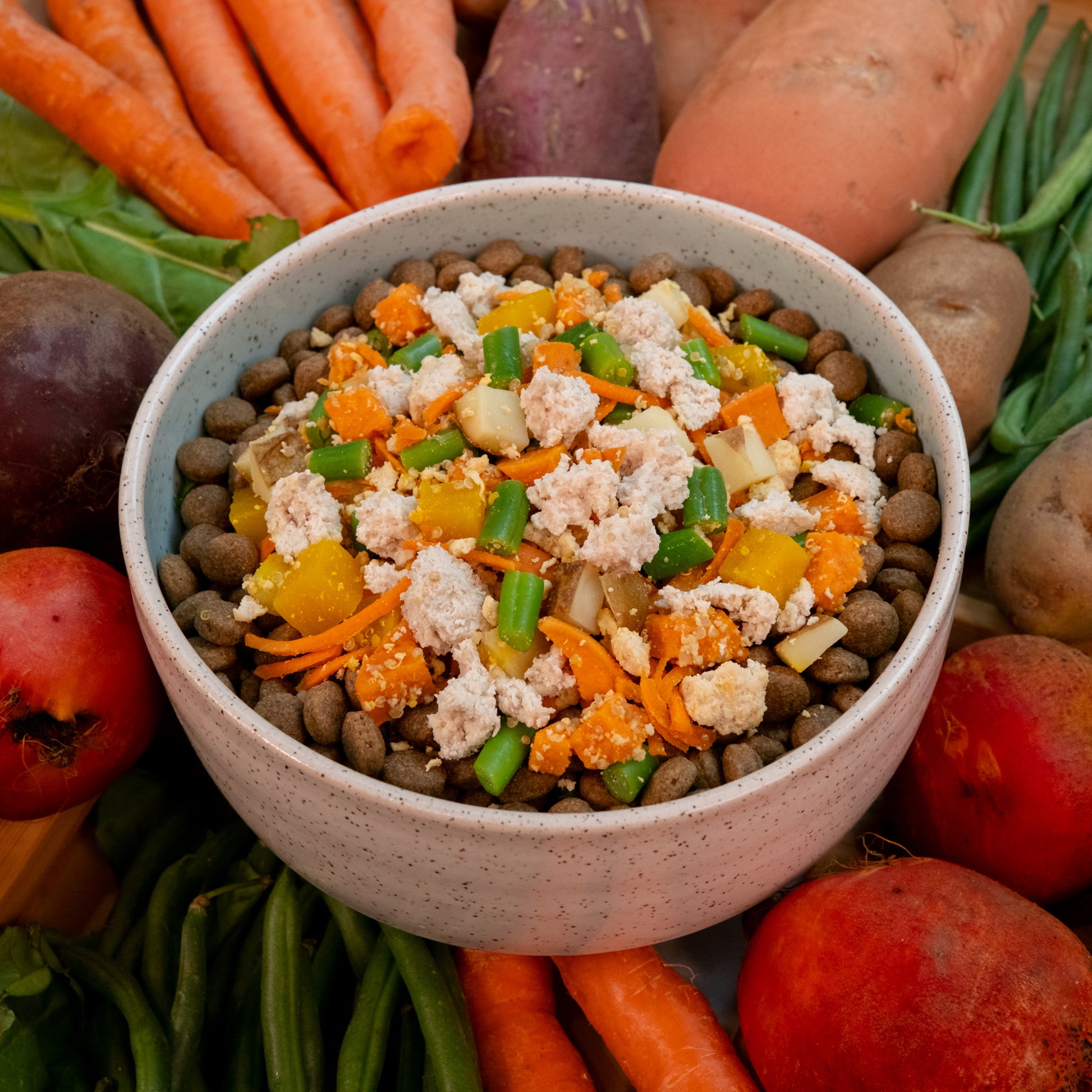 A vibrant, protein-rich topper made with chicken, quinoa, and colorful vegetables for sustained energy and cellular health. Beets and carrots boost natural antioxidants, while sweet potato supports endurance and gut function. Ideal for active dogs, younger pups, or those who need that extra lift — nourishment that fuels the everyday adventure.